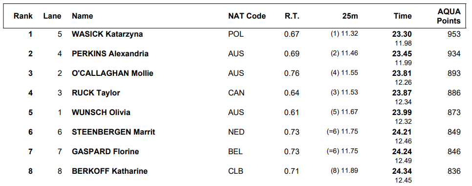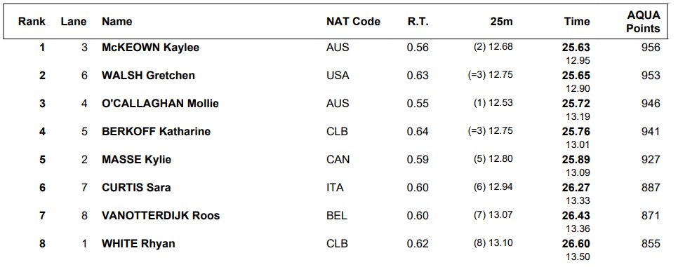 Australian swimmers flipped 1-2 at the halfway point in this final, with Mollie O’Callaghan under world-record pace and McKeown in second, but Walsh blasted ahead off the wall. At the end, though, McKeown battled back to finish in 25.63, just clear of Walsh’s 25.65. O’Callaghan was a further seven hundredths behind in 25.72, followed closely by American Katharine Berkoff (25.76). Kylie Masse, the Canadian who also has world titles to her credit, took fifth (25.89).