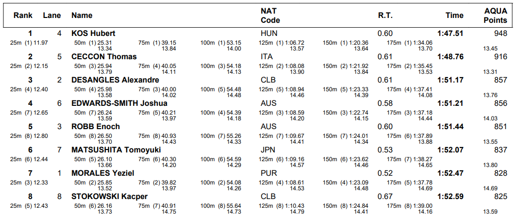 Taking second here was Ponti, the Swiss star who is the reigning world champion in this event. Ponti had the best freestyle leg (12.42) to jump from fourth to second place at the end with a final time of 50.76. Kos was third in 50.99, just ahead of American Grant House (51.07). Thomas Ceccon, second to Kos in the 200 back earlier in the night, came in fifth (51.35).