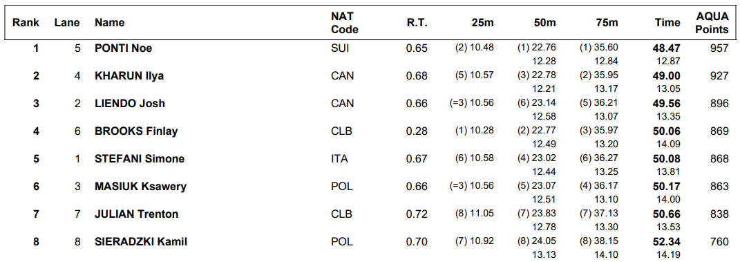 Kharun picked up second place here in 49.00 while fellow Canadian Josh Liendo came in just behind at 49.56. No one else got under 50 seconds here, with Finn Brooks (50.06) and Simone Stefani (50.08) the best of the rest.