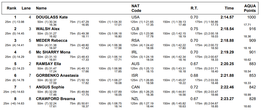 Douglass recorded a time of 2:14.57 on the way to her fifth 200 breast victory over the past two World Cup seasons. The time actually matched the time that had been the world record set prior to Douglass’ emergence, which was held by former U.S. star Rebecca Soni. Second place here went to Alex Walsh, a training partner of Douglass at the University of Virginia. Walsh clocked 2:18.54, while South Africa’s Rebecca Meder came in third at 2:18.88.