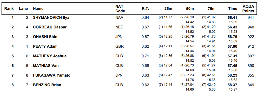 Shymanovich was one hundredth behind Corbeau at the halfway point, but he cleared his Dutch rival by two hundredths coming home. Shymanovich finished in 56.41, two hundredths ahead of Corbeau’s 56.43. Both swimmers swam much quicker than one week earlier, where Corbeau won in 56.67 and Shymanovich took second in 57.18.