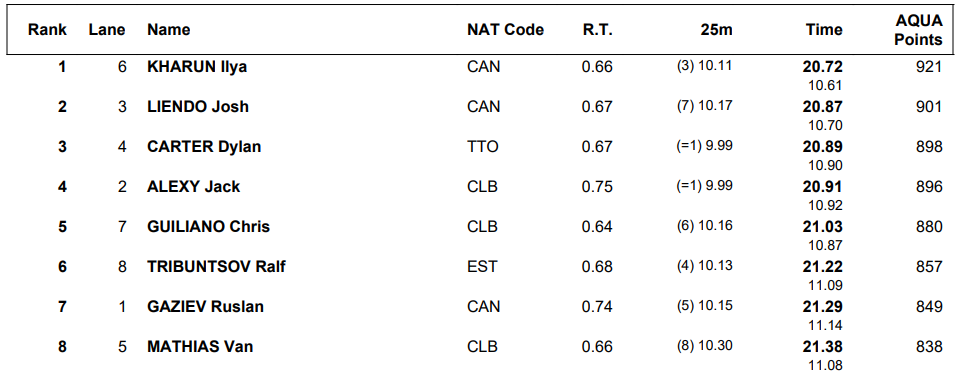 A pair of Canadian men, both better known for their butterfly abilities and both just minutes removed from competing in the 100 butterfly, showed off some sizzle in this event. Ilya Kharun came through down the stretch, covering the second length in 10.61 to easily surpass the rest of the field. That brought him to the wall in 20.72, 0.15 ahead of a field consisting of swimmers who compete more consistently in sprint freestyle.