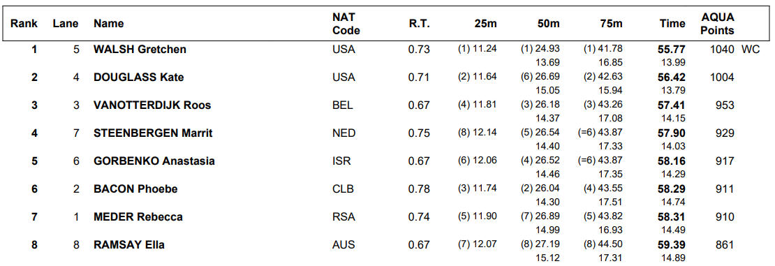 Walsh never trailed in this final, losing some ground to University of Virginia training partner Kate Douglass on the back half but never being challenged. Walsh finished in 55.77, the third-fastest performance ever and 0.14 ahead of the previous World Cup record she set last week. Douglass was second in 56.42, just behind her own best of 56.34 from last week but still ahead of anyone else on the all-time list, while Belgium’s Roos Vanotterdijk placed third in 57.41.