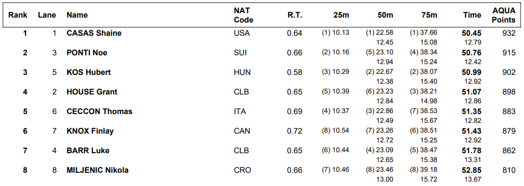 Shaine Casas survived a scare in the preliminary round, when he was merely the seventh-best qualifier for the final. Once he made it into the top-eight, the 25-year-old American never trailed, beating butterfly specialist Noè Ponti to the wall at the halfway point and supreme backstroke Hubert Kos to the halfway point. Casas extended the advantage on breaststroke before powering to the wall in 50.45. With the swim, he became the fifth-fastest man in history behind Caeleb Dressel, Leon Marchand, Vladimir Morozov and Ponti.