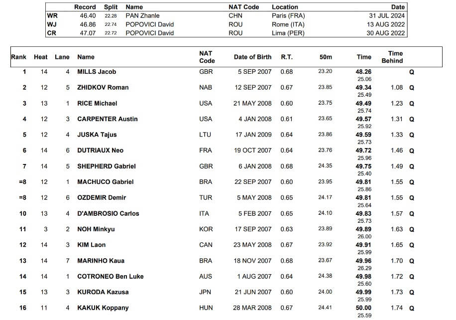 Japan’s Raito Numata secured the top seed in the final of the 400 individual medley after cruising through his prelim in 4:16.96, which was slightly quicker than the 4:17.20 of China’s Zheng Yi. Romanian Robert-Andrei Badea was third in 4:19.37 while Japan’s Yumeki Kojima was fifth in 4:21.10. Kojima is the world junior record holder at 4:09.38 and earlier was the silver medalist in the 200 IM.