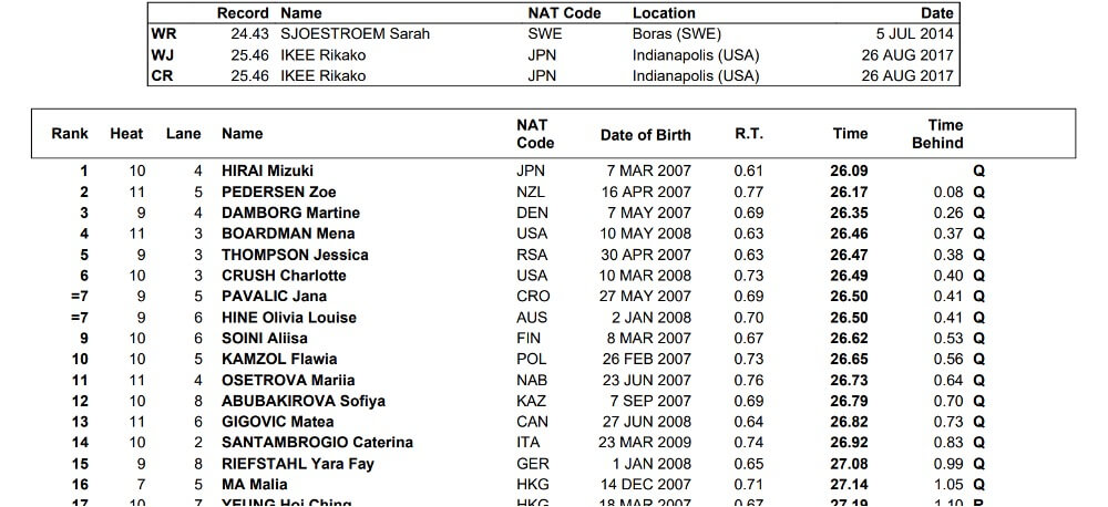 Coming off an excellent butterfly leg in Japan’s mixed medley relay victory the previous night, Mizuki Hirai led the opening round of the 50 butterfly. The University of Tennessee recruit went 26.09 to place .08 ahead of New Zealand’s Zoe Pedersen (26.17). Denmark’s Martine Damborg checked in with the third-fastest time, going 26.35.