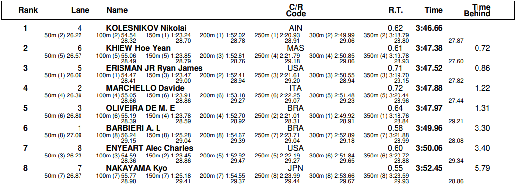 Silver went to Malaysia’s Khiew How Yean, who spent most of the race in fourth or fifth place jumping up on the last 50. He finished in 3:47.38, with Erisman securing bronze in 3:47.52. Italy’s Davide Marchello came in at 3:47.88 while Oliveria fell all the way to fifth place, his final time 3:47.94.