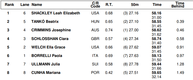Leah Shackley of the United States was upset one day earlier in the 100 backstroke final, but she got the better of the field in this 100 butterfly. Shackley was just off the lead at the halfway point, training Australia’s Josephine Crimmins and Hungary’s Beatrix Tano, but a 31.00 closing split blasted her ahead of the field by almost four tenths.
