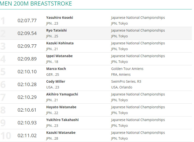 Yasuhiro Koseki Posts World Best in Incredibly Deep 200 Breast Field
